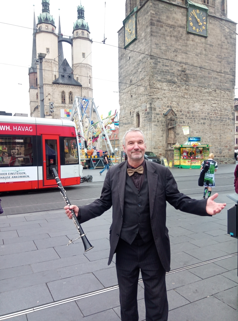 Zur halleschen swingenden Stadtführung erfahren Sie von Volkhard Brock, dem Swing- & Dixielandklarinettisten, warum hat die Marktkirche diese beiden ungleichen Turmpaare, warum konnte Halle vor über 1000 Jahren wirtschaftlich aufstreben, wo mußte Bernd Göbel mit den Brunnenfiguren am Hallmarkt seinen Verweis auf die Verdorbenheit von Kardinal Albrecht verstecken, warum hat die Moritzkirche keinen Turm oder was nicht viele Stadtführer wissen dürften: wo wurden die weltweit in Displays verbauten Flüssigkristalle erfunden, sowie, warum hat Halle einen Dom & wo ist er versteckt.